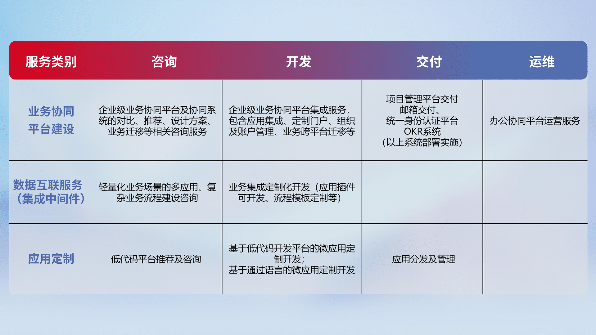 针对钉钉、、、企微、、、、IDaas等平台级产品提供产品的规划、、、、方案、、交付、、、、定制化开发等服务,,实现如统一协同办公、、、智能客户服务、、、混合会议管理、、、智能数据查询、、、、等业务场景,,实现数字化转型。。。
